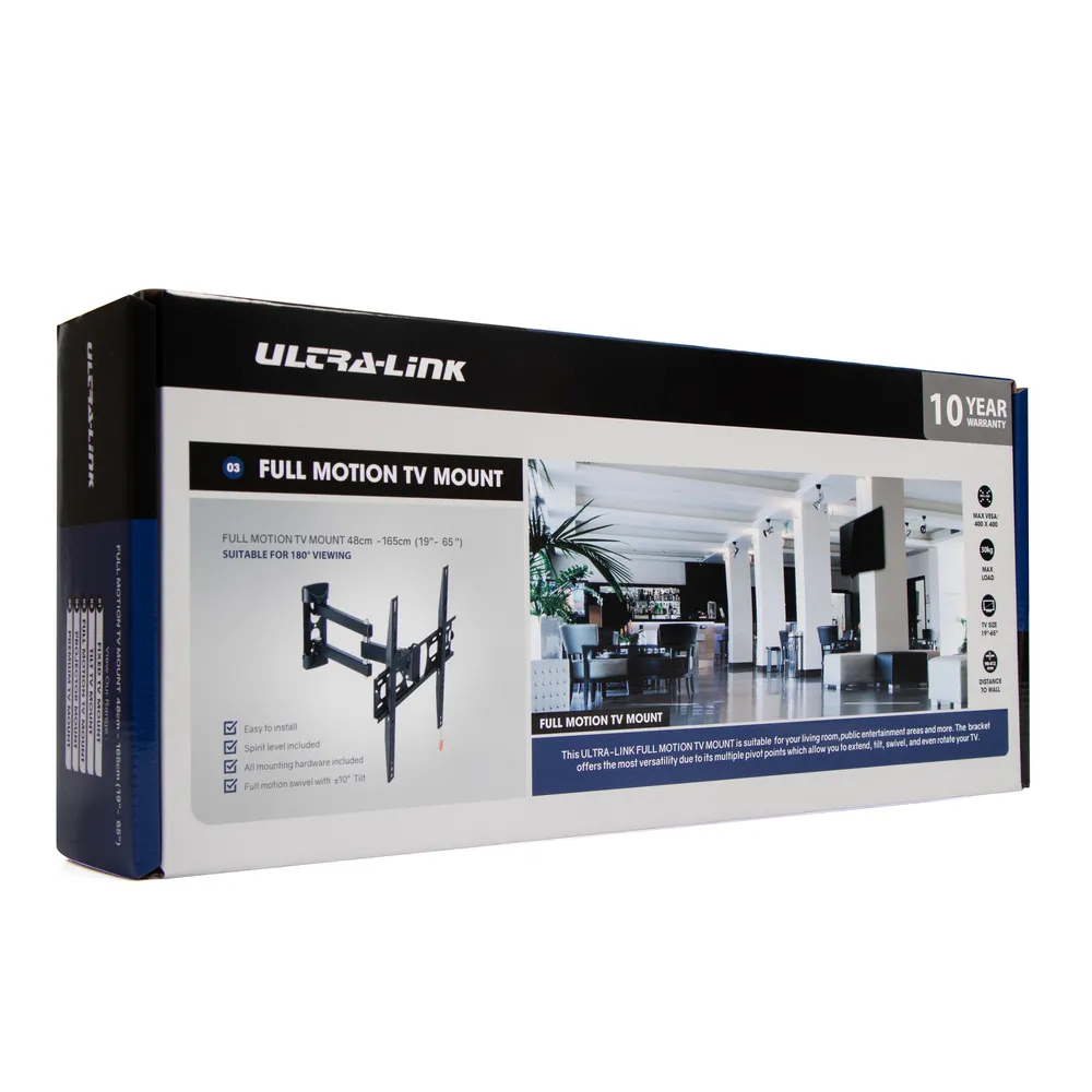 With a maximum VESA compatibility of 400×400, the Ultra-link Full Motion TV Mount caters to TVs ranging from 19 inches to 65 inches, ensuring a space-saving and customized fit for your entertainment setup.